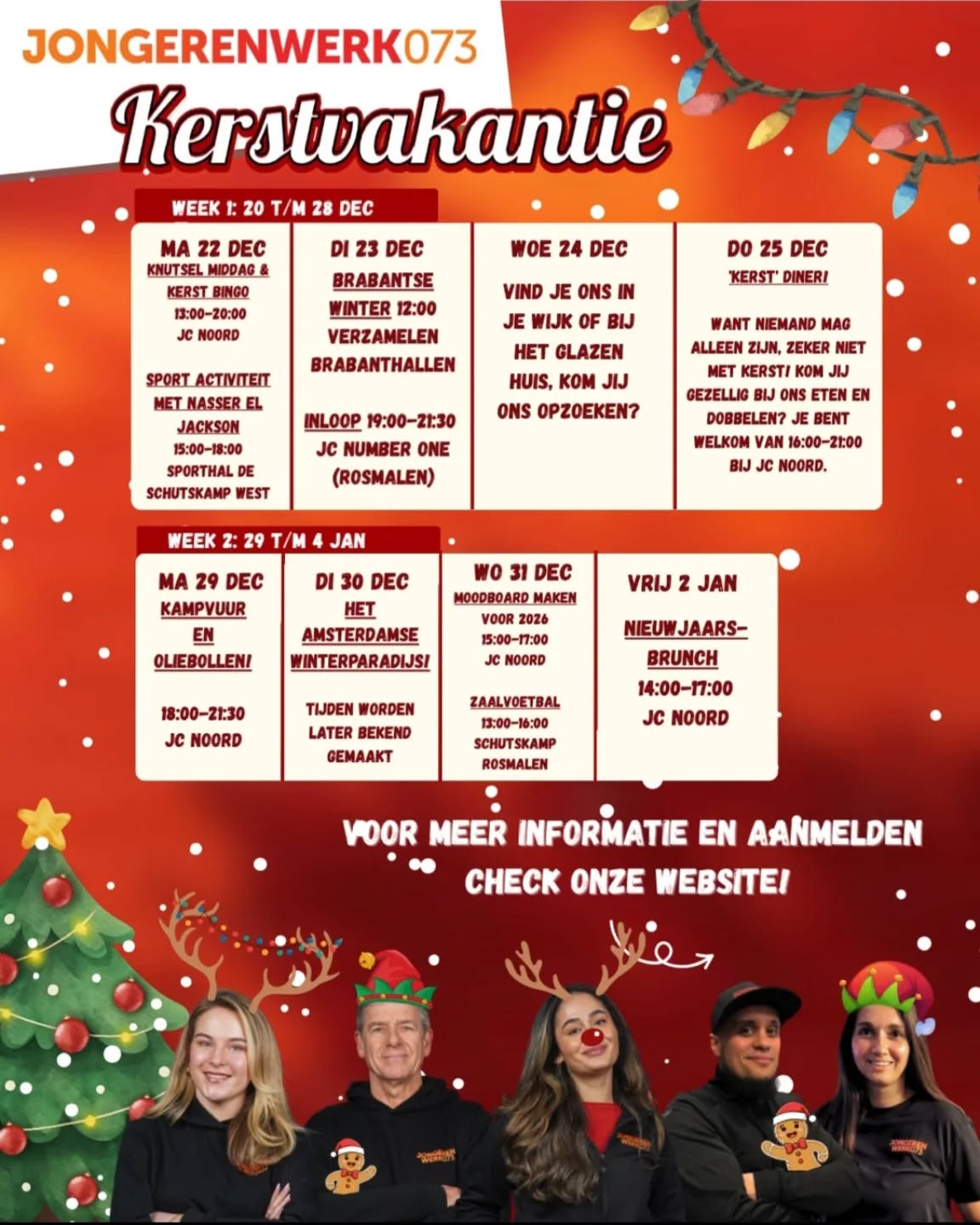 Jongerenwerk073 pakt deze winter groots uit met gezellige, creatieve en onvergetelijke activiteiten. Van kaartjes maken tot winters uitjes en foute bingo — jij wil dit niet missen! Voor meer info & aanmeldingen: kijk op de website!